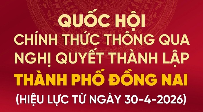 Quốc hội đã chính thức thông qua Nghị quyết thành lập thành phố Đồng Nai trực thuộc Trung ương, có hiệu lực từ ngày 30/4/2026. Đây là dấu mốc quan trọng, mở ra bước phát triển mới về mô hình tổ chức...
