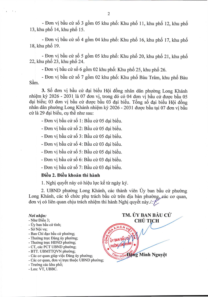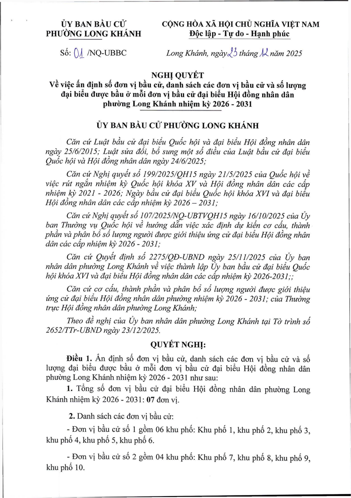 Nghị Quyết về việc ấn định số đơn vị bầu cử, danh sách các đơn vị bầu cử và số lượng đại biểu được bầu ở mỗi đơn vị bầu cử đại biểu Hội đồng nhân dân phuờng Long Khánh nhiệm kỳ 2026 - 2031