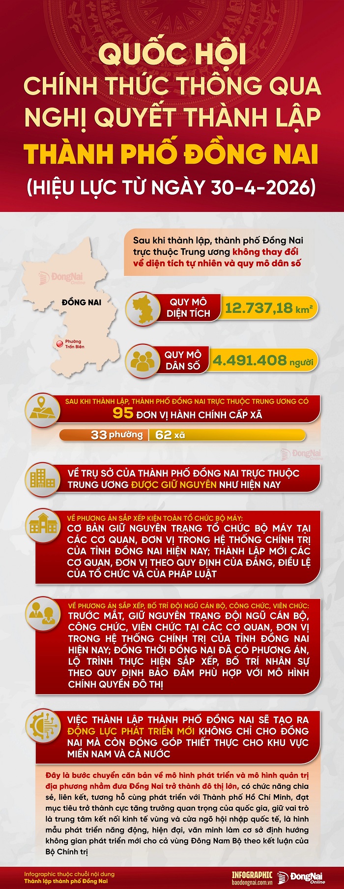 Quốc hội đã chính thức thông qua Nghị quyết thành lập thành phố Đồng Nai trực thuộc Trung ương, có hiệu lực từ ngày 30/4/2026. Đây là dấu mốc quan trọng, mở ra bước phát triển mới về mô hình tổ chức và quản trị, tạo nền tảng để địa phương bứt phá trong giai đoạn tới.