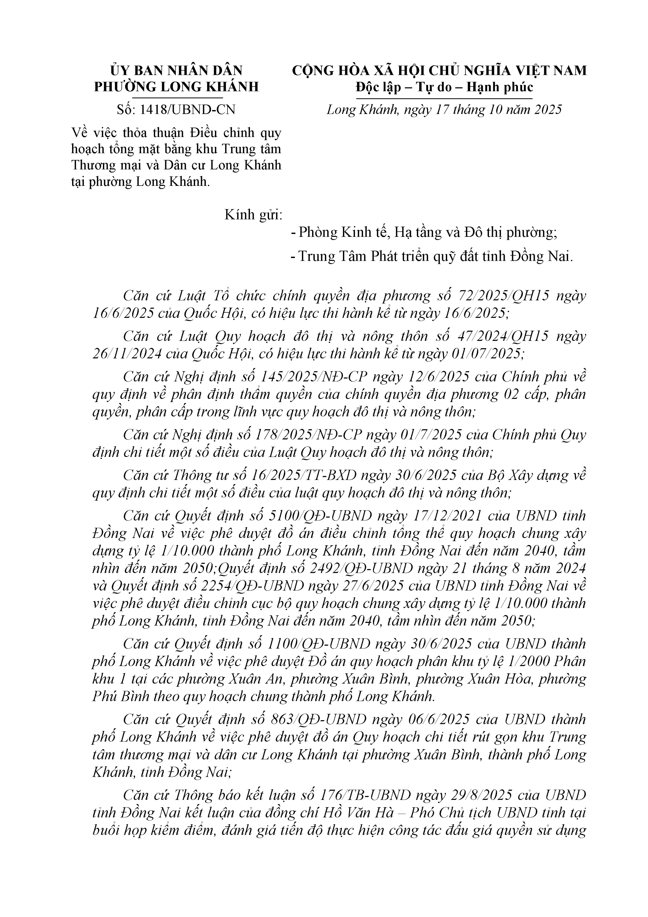 Thỏa thuận Điều chỉnh quy hoạch tổng mặt bằng khu Trung tâm Thương mại và Dân cư Long Khánh tại phường Long Khánh.