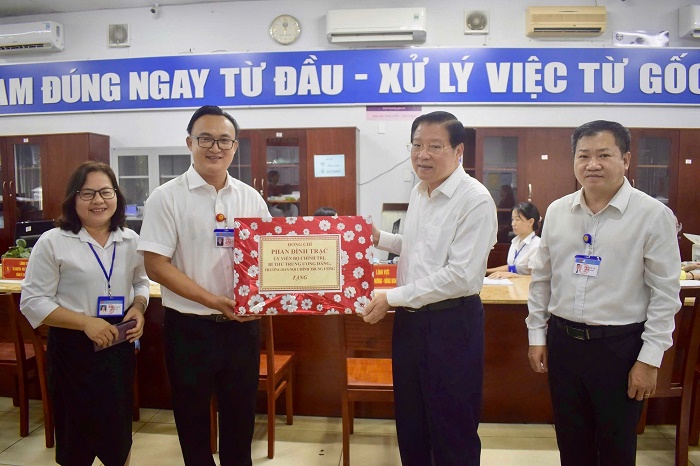 Cũng tại buổi làm việc, đồng chí Phan Đình Trạc đã trao tặng phần quà cho Ban Giám đốc Trung tâm Hành chính công phường Long Khánh.